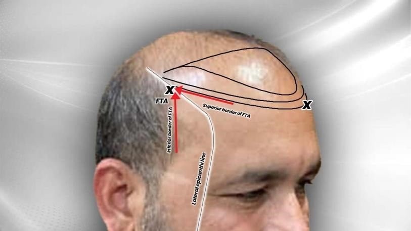 A line is drawn vertically from the lateral epicanthus of the eye. The FTA is situated at the site where the lateral epicanthi lines meet the temporal hairline.
