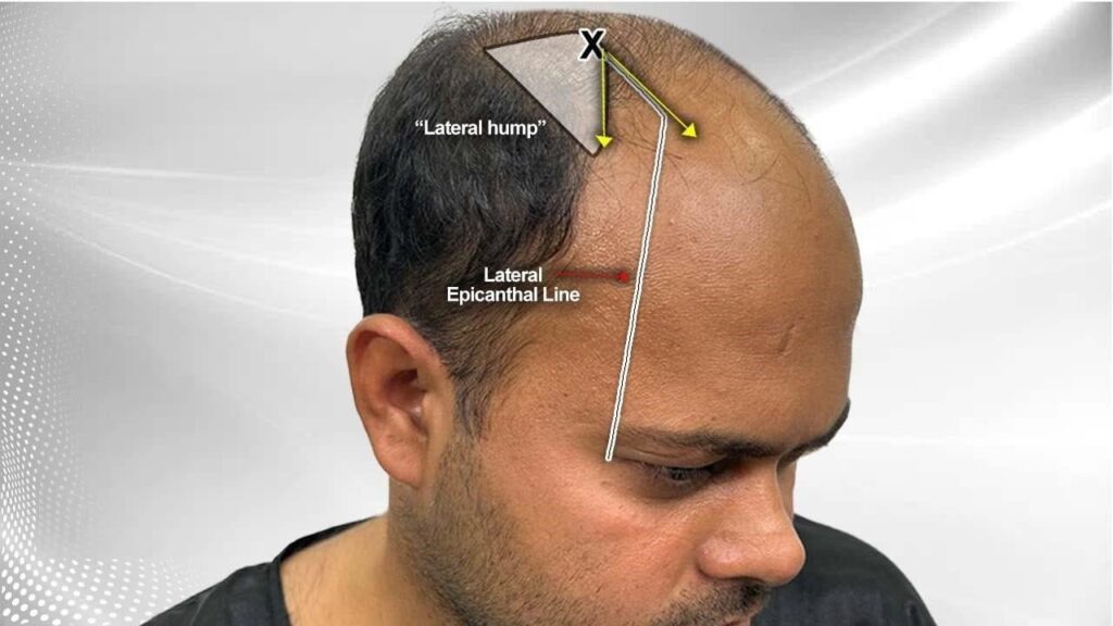 The lateral hump (LH) gives a target to intersect and establish the FTA. The down sloping frontal border of LH runs forwards before it slopes downwards and intersects. The LEL decides the site of the reconstructed temporal hairline.