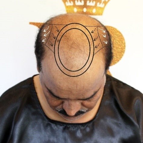 To avoid this mistake draw Oval pattern for a frontal-midscalp forelock pattern on a Norwood stage VI/VII patient.