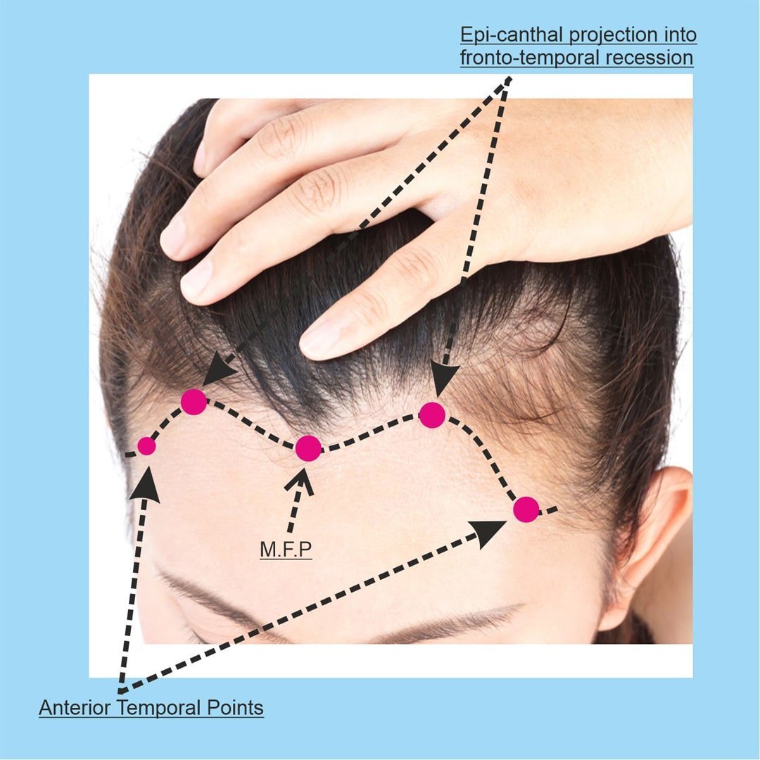 After you have located the MFP and FTA, the frontal hairline is designed by drawing a gentle slope that connects the MFP to FTA. MPP assists where the frontal hairline starts to curve posteriorly towards the FTA. The more conservative hairline needs to move from rounder shape to oval or bell shaped.