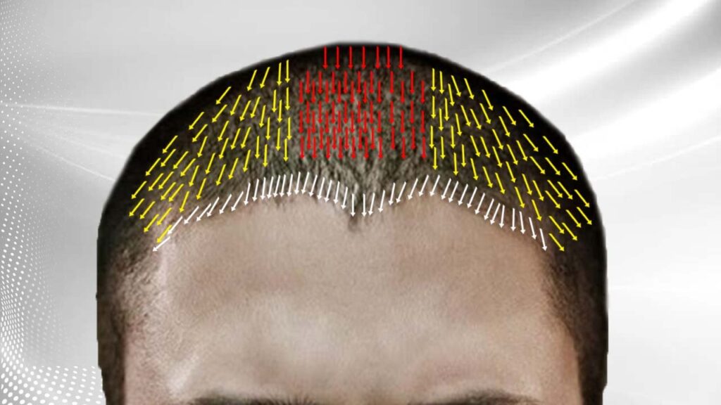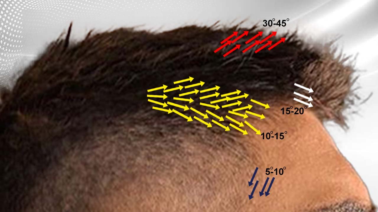Angle and direction are distinct entities. Angle is the degree of elevation that your hair has when it leaves the scalp. Direction is the way the hair points when it leaves the scalp. The surgeon needs to pay close attention to changes in the angle as well as the direction when he transplants different parts of the hairline. Frequently, there are a few remaining miniaturized hair that act as a blueprint for the surgeon to follow.