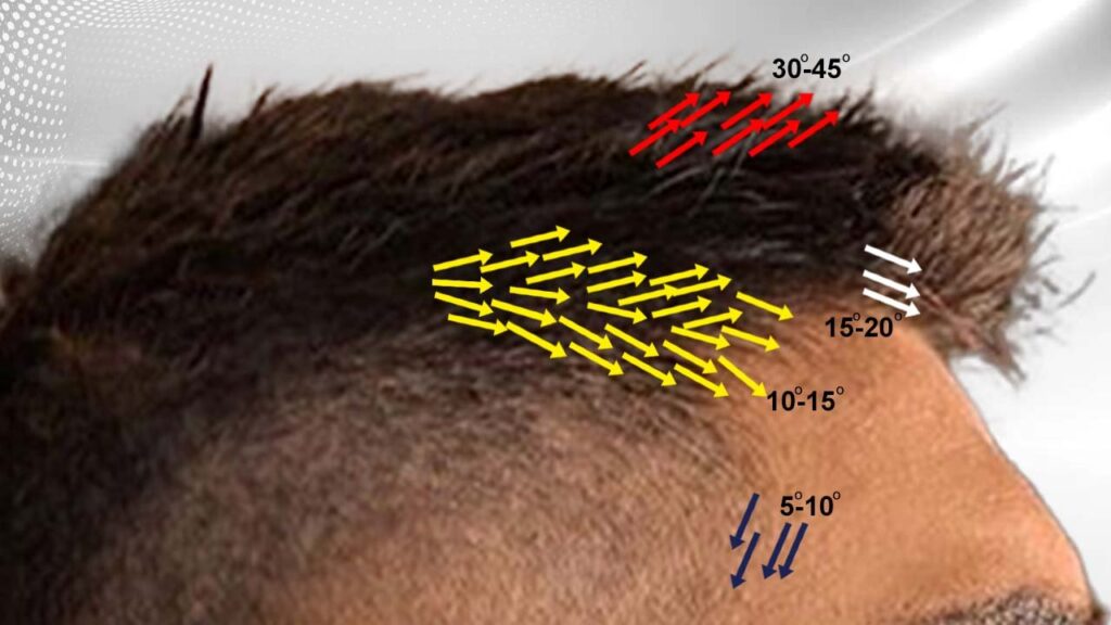 - When you get to the frontal hairline, the angle changes to 15° to 20°, while the direction remains pointing forwards. Occasionally, the hair in this area may curve towards the right or left.