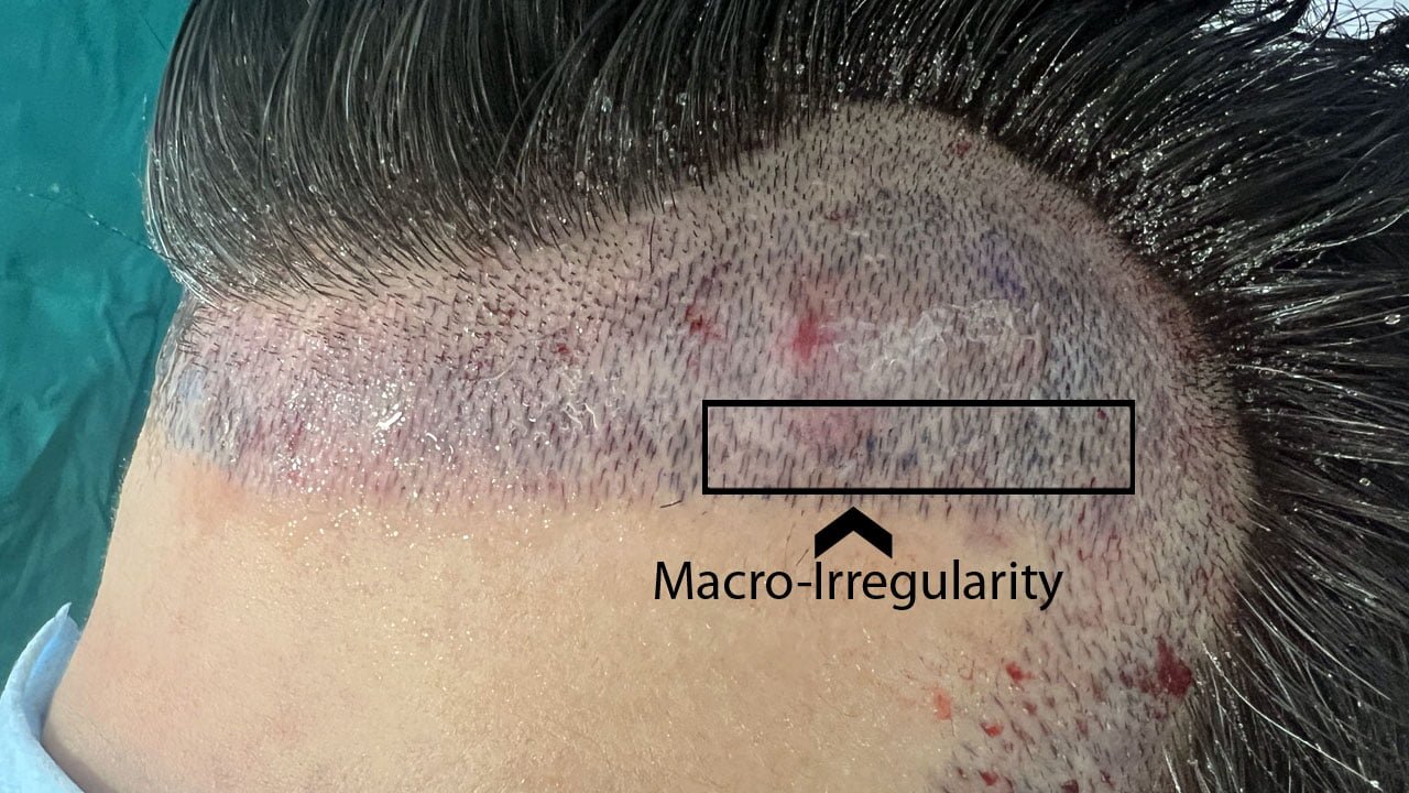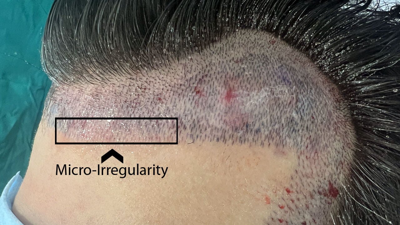 Closely examining the TZ shows tiny, scattered and patchy clusters of hair along its border. These clusters differ in shape and depth and bear a resemblance to ill-defined triangles of varying sizes. These clusters create intermittent density along the TZ. This form of irregularities is known as micro irregularity, given that, it is more obvious when viewed close-up rather than from far. This helps avoid a straight or stitch – like hairline.