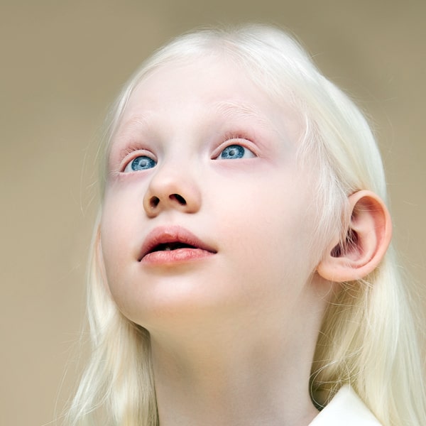 Albinism is best known for extremely pale skin that may have little to no color. This genetic condition can also make your hair white and your eyes light blue in color. People with albinism are born with this condition because of a genetic mutation.